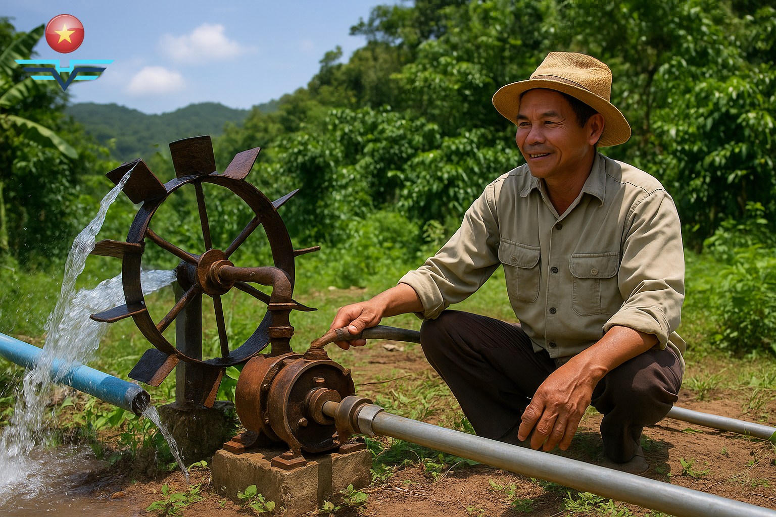 Driven by the challenge of supplying water to 2 hectares of hillside crops, Phan Chang asked himself: “Why not use the power of flowing water itself to lift water uphill?”