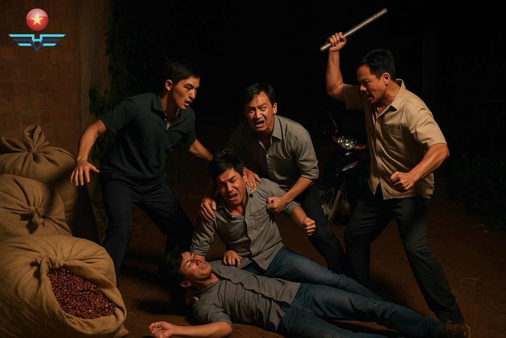 The incident occurred around 9 p.m. on November 18, 2011, in the alley leading to Mr. Hưu’s home, while his family was selling coffee to a different purchasing firm. Four employees of Thu Thủy Company—Lê Văn Bảo, Nguyễn Văn Đoàn, Trần Văn Đông, and Trư Văn Quynh—arrived by motorbike, blocked the alley, and carried weapons. They attacked Mr. Bùi Duy Cường, a coffee buyer representing Thái Hòa Coffee Company’s Sơn La branch. When family members, including Mr. Trung, tried to intervene, Bảo and Đông chased and struck them with weapons.