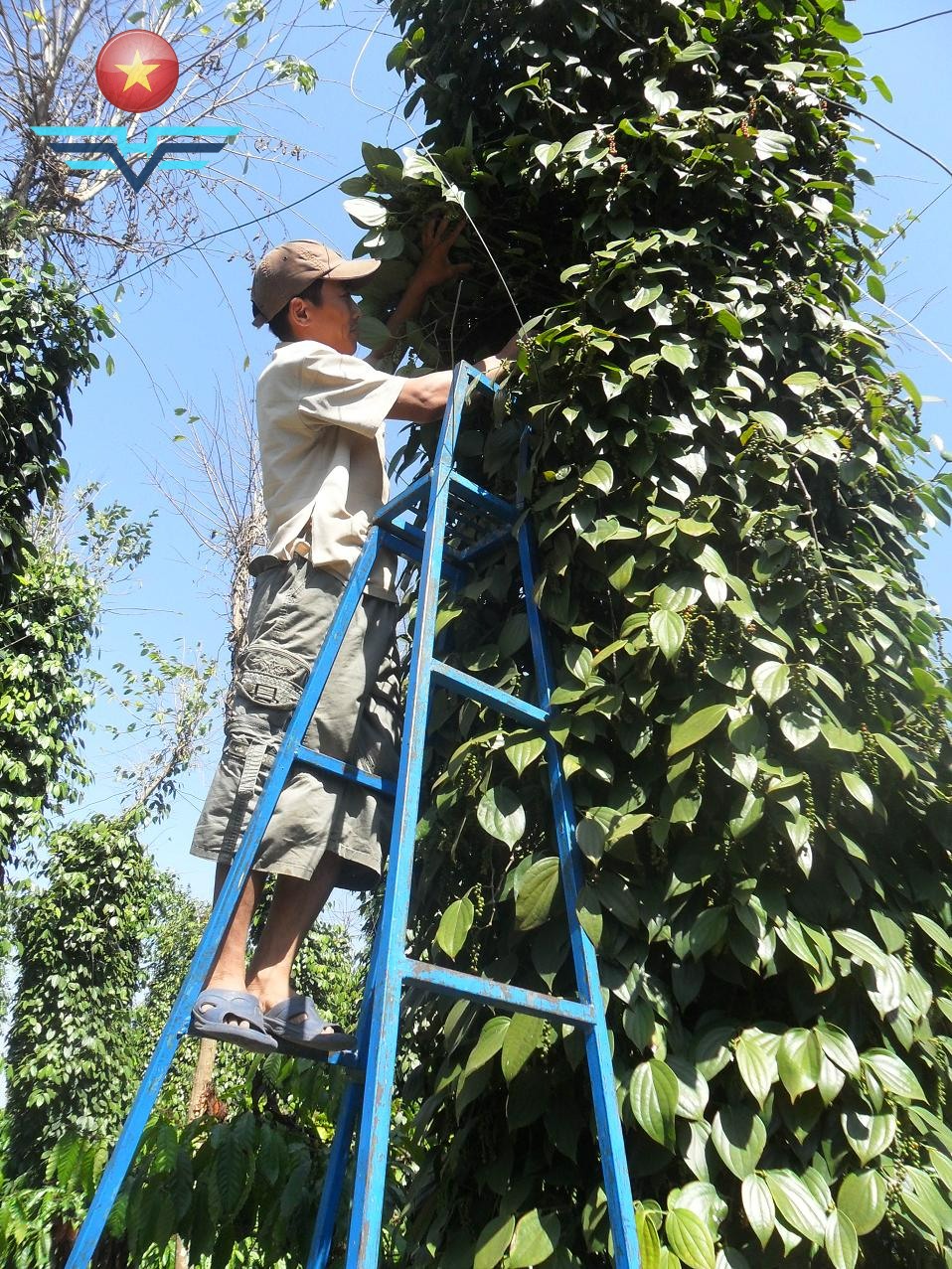 In 2005, Phục planted 300 lồng mức trees across his coffee field to create living supports for the pepper vines. Within just over two years, he removed the dead stakes and trained the vines to climb the living trees.