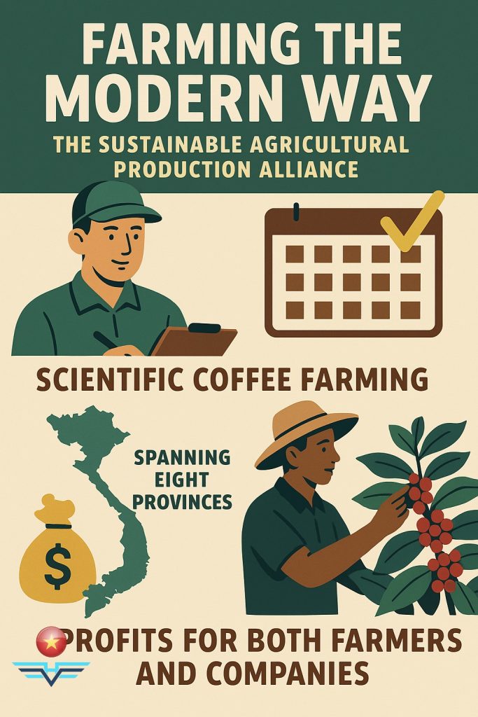 This model—known as the Sustainable Agricultural Production Alliance—has already shown notable success in coffee. Farmers who join the alliance receive a detailed annual coffee-production plan broken down by month. Experts train them in every step of coffee care: planting windbreak trees, applying fertilizer, preventing post-harvest losses, and proper drying and processing—all aligned with sustainable coffee-production standards.