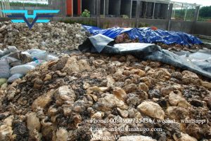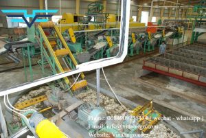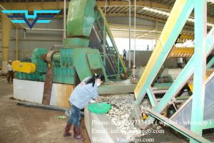 After being treated in pit 1, it is put on a bucket conveyor through a cutting machine, through lake 2, workers collect garbage in lake 2.