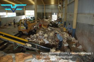 Workers collect garbage: plastic wrap, rope, tree chips... at the raw material warehouse.