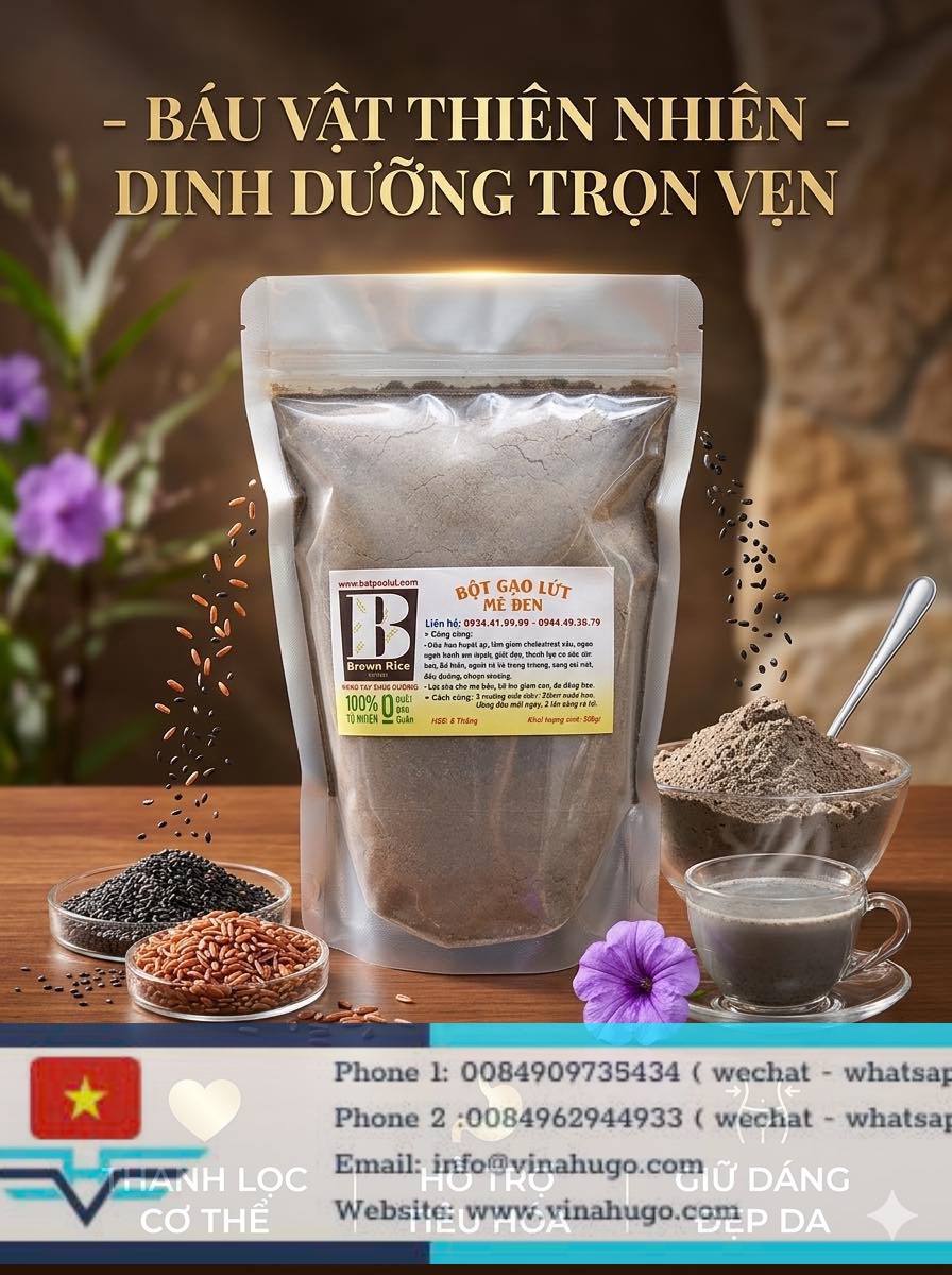 Brown Rice & Black Sesame Powder is a classic combination in Vietnamese macrobiotic nutrition (Thực dưỡng). This blend combines the high-fiber, vitamin-rich benefits of whole-grain brown rice with the mineral-dense, antioxidant properties of toasted black sesame seeds.