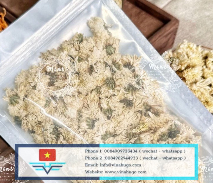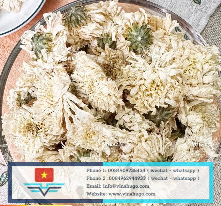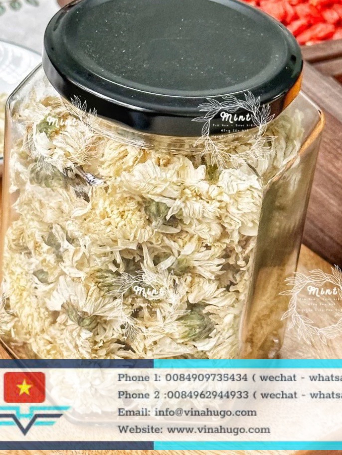 At Vinahugo, we cultivate our white chrysanthemums in the cool, high-altitude regions of Vietnam. The flowers are harvested as young buds or full blossoms and dried using heat-pump dehydration technology. This ensures the snow-white petals and nutrient-dense centers remain intact, providing a premium brewing experience that is as beautiful as it is healthy.