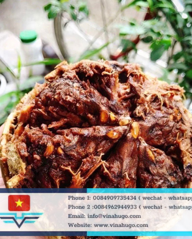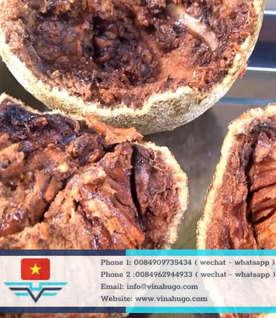 Appearance: Rough, woody, globose shell (approx. 5cm–12cm diameter); dark chocolate-brown, mealy pulp with small white seeds.