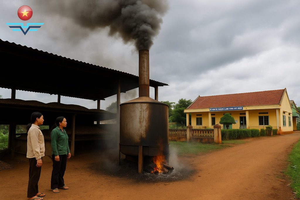 For more than a year, dozens of households in Son Thuong Hamlet, Dak Gan Commune, Dak Mil District (Dak Nong Province) have been struggling to “live with” the smoke, dust, and pollution coming from the coffee-drying kiln of Mr. Nguyen Ngoc Quang’s family. Even more concerning, less than 50 meters away from the kiln is Hoa PLang Kindergarten, where nearly 100 children study.
