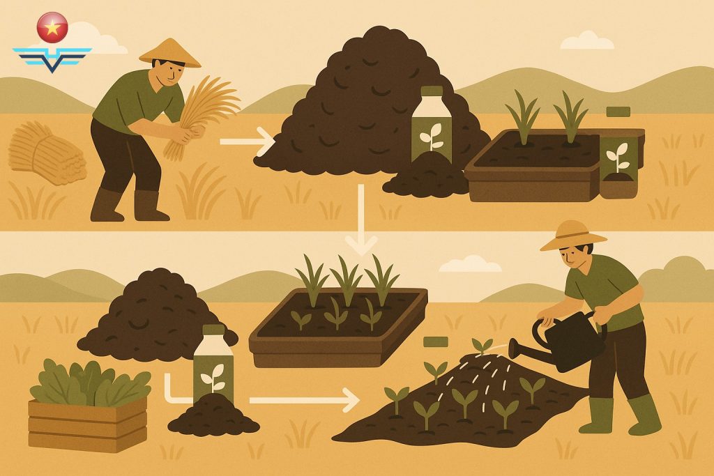 Produced on an industrial scale, the product is inexpensive (40,000 VND per ton of straw), requires only 200 grams of inoculant per ton, and has a short processing time of 20–25 days, making it suitable for farmers’ seasonal needs. The resulting organic compost meets agricultural standards, conserves nutrients, and improves soil chemistry.